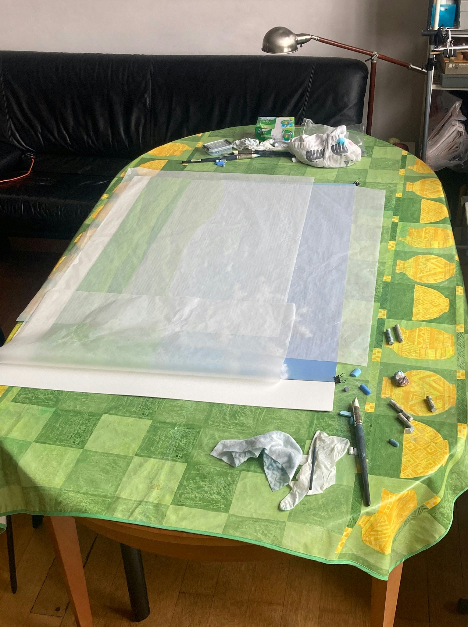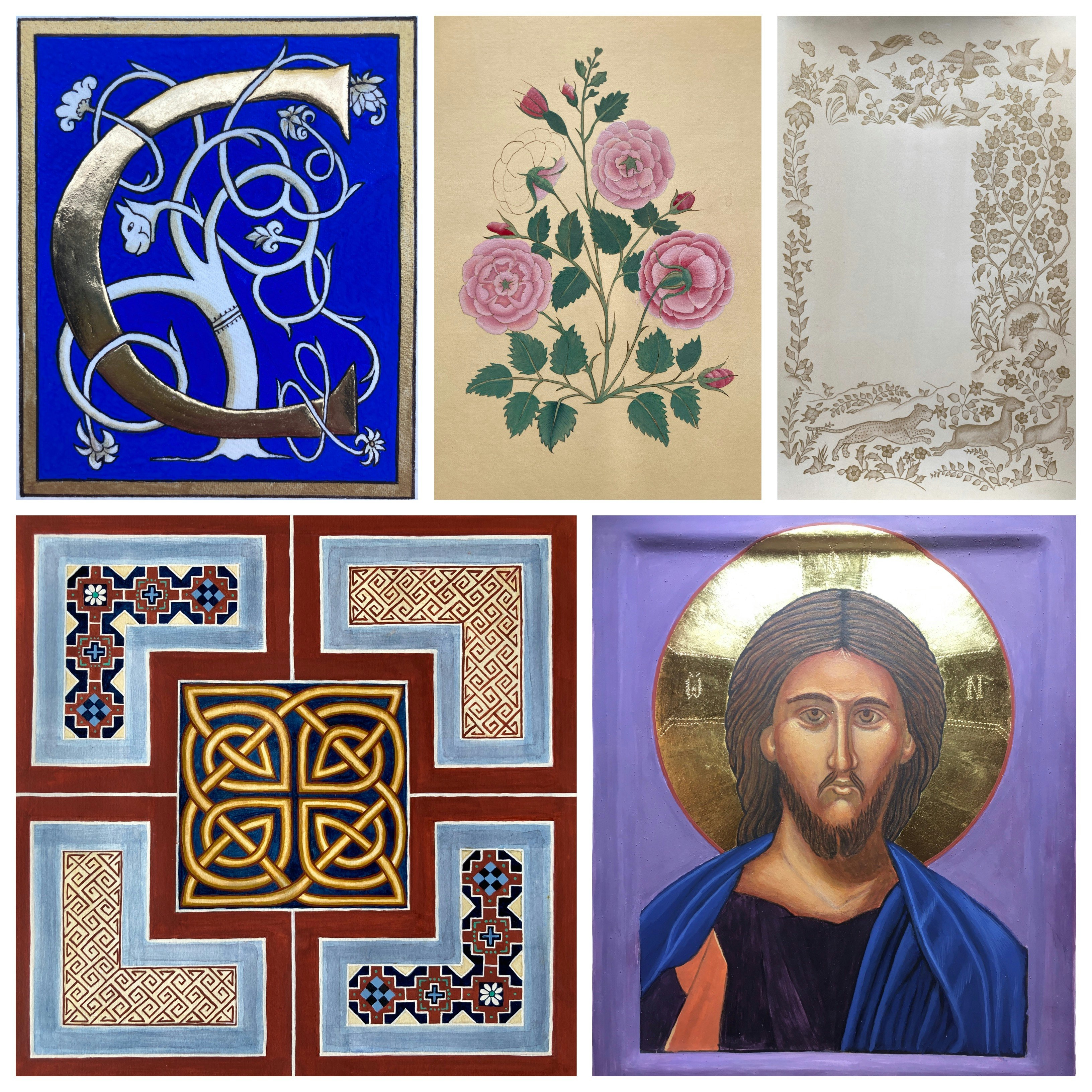 Outside my work in pastel... A sample of finished and unfinished work from The King's Foundation School of Traditional Arts, clockwise: raised guilding letter of my own design, Indian miniature flower painting (water and gum arabic based pigments) , Islamic Halkar technique (gold leaf made into paint with water and gum arabic), Byzantine icon (egg tempera and gold leaf), Pictish patterns (water and gum arabic based pigments)
